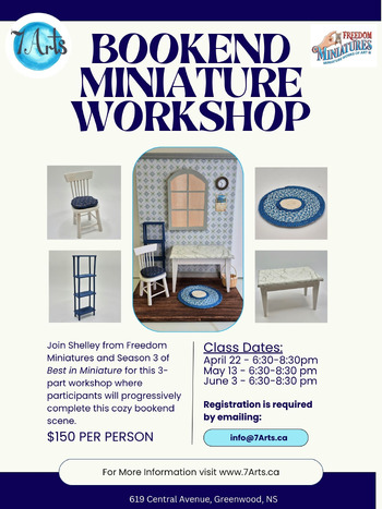One 2-hour class will be held each month, for 3 months (dates are Apr 22, May 13, & June 3 from 6:30-8:30 pm). Participants will have their choice of colour scheme and will be encouraged to finish the details of the bookend scene with their own miniature creations or ready-made items. The basic foundation of wall and floor will be supplied. Participants will add their flooring and wallpaper, wooden trim and window (provided). The table will be painted by participants after adding the decorative surface. The braided rug, seat cushion, shelf unit, wall cloak and calendar will also be made by participants with supplied materials. Note that the window in the sample is a facsimile, the actual window will have "glass" and proper construction!