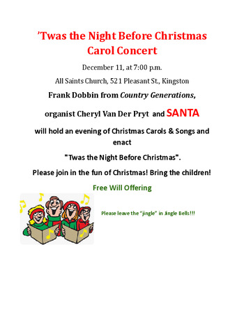 Frank Dobbin from Country Generations, organist Cheryl Van Der Pryt and SANTA will hold an evening of Christmas Carols & Songs and enact "Twas the Night Before Christmas".