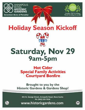 Kick off the holiday season in the Annapolis Royal Historic Gardens with some family fun. We'll be launching our beloved Courtyard Bonfire season, offering hot apple cider and there will be some family fun activities as well. And of course, the Gardens Shop will be open for your holiday shopping needs.