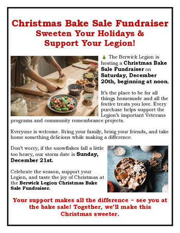 Celebrate the season, support your Legion, and taste the joy of Christmas at the Berwick Legion Christmas Bake Sale Fundraiser.