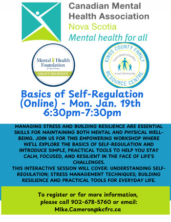 CMHA NS Module (Online) - Managing stress and building resilience are essential skills for maintaining both mental and physical well-being. Join us for this empowering workshop where we’ll explore the basics of self-regulation and introduce simple, practical tools to help you stay calm, focused, and resilient in the face of life's challenges.