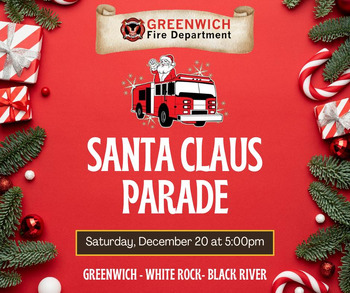 Greenwich Fire Dept annual Santa Claus Parade starts at 5pm at Elderkin's and will travel through Greenwich, White Rock & Black River, with stops at White Rock Community Center and Black River & District Community Hall. Anticipated arrival at White Rock hall is 6:15pm... come & enjoy hot chocolate and a visit with Santa. Everyone welcome.