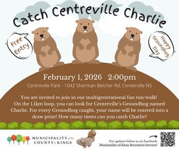 You are invited to join in our multigenerational fun run/walk! On the 1.1km loop, you can look for Centreville’s Groundhog named Charlie. For every Groundhog caught, your name will be entered into a draw prize! How many times can you catch Charlie?