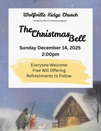 Wolfville Ridge Baptist Church presents their Christmas program "The Christmas Bell". A Christmas Nativity story with music. Free will offering and refreshments to follow.