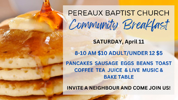 Come and warm up to the weekend with a delicious breakfast and the company of friends. Sausage, baked beans, scrambled eggs, pancakes, tea, coffee, and juice are included. Live music and a bake table full of delicious goodies to take home!