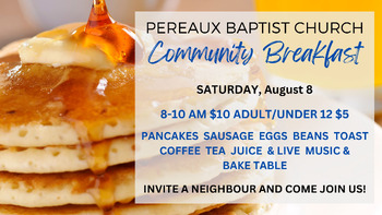 Come and warm up to the weekend with a delicious breakfast and the company of friends. Sausage, baked beans, scrambled eggs, pancakes, tea, coffee, and juice are included. Live music and a bake table full of delicious goodies to take home!