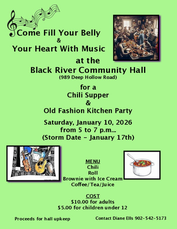 Enjoy a chili with roll, brownie with ice cream and tea, coffee, or juice with the sounds of kitchen party music