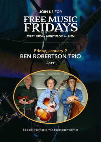 Ben is well known in the area for his vocals and guitar work. He has played and sung with the Big Valley Swing Orchestra for over 25 years and set out on his own a few years ago as a solo artist, including a long stint as a regular performer at Winegrunt in Windsor. He, Andy, and Andrew were among the founding members of award-winning gypsy jazz band Swingology, and they have reunited as a trio to bring an eclectic mix of jazz/swing, classic pop, country, and old time fiddle tunes to new fans.