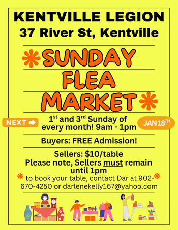 Flea Market at the Kentville Legion. To book your table, contact Dar by calling/texting 902-670-4250 or email [email protected].
