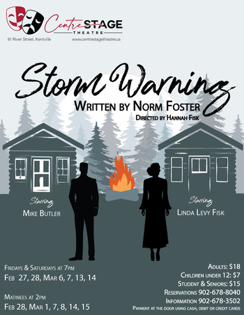 Storm Warning is written by Norm Foster and directed by Hannah Fisk. Set in cottage country in 1953, Jack Forrester (Mike Butler), a damaged world War II vet, has retreated from life. Then one weekend he meets Emma Currie (Linda Levy-Fisk), an amphetamine-popping chart writer for a big band. Both lives will change forever as these two opposites collide.
