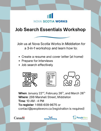 Join us at Nova Scotia Works in Middleton for a comprehensive workshop that covers key aspects of the job search process! Learn how to create a standout resume and cover letter, prepare for job interviews, and explore Nova Scotia Works Online to enhance your job search skills. This workshop will equip you with the tools and knowledge you need to confidently navigate the job market and take the next step in your career. Don't miss out on this valuable opportunity!