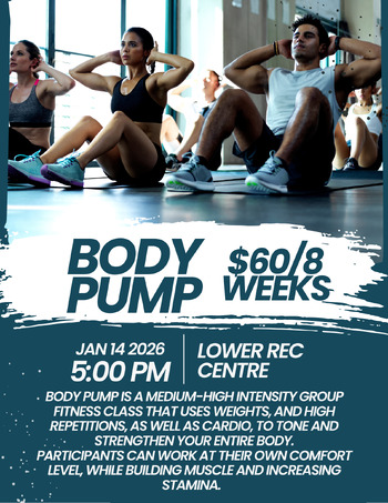 Body Pump is a medium-high intensity group fitness class that uses weights, and high repetitions, as well as cardio, to tone and strengthen your entire body.