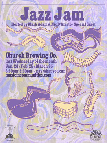 Hey there jazz lovers! Join us for a night of smooth tunes and laid-back vibes at The Church Brewing Co. The evening will be hosted by Mark Adam and Nic D'Amato.