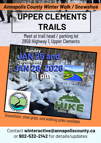 Join the Winter Active Team for a winter walk / snowshoe at Upper Clements Trails. Meet at the trail head/parking lot. Snowshoes, shoe grips, and walking poles available. Free. No registration required but in the event of severe weather, please call/email.