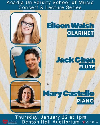 Acadia School of Music’s Concert [&] Lecture Series will feature a performance by Eileen Walsh (clarinet/bass clarinet), Jack Chen (flute), and Mary Castello (piano) – a trio of AUSOM faculty members who have been collaborating for several years.