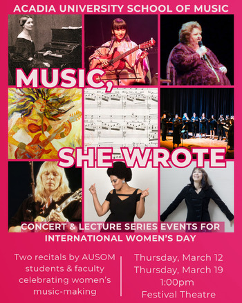 The Acadia School of Music Concert & Lecture Series presents a recital recognizing women’s creativity and music-making throughout the centuries.