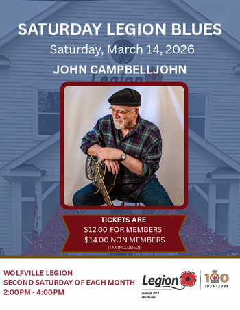 Legion Saturday Blues is a monthly fixture at the Wolfville Legion. We bring in the best talent around the province and this month features the fabulous John Campbelljohn.