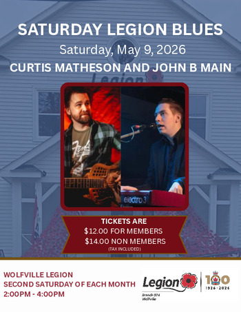 Legion Saturday Blues is a monthly fixture at the Wolfville Legion. We bring in the best talent around the province and this month features the talented duo of Curtis Matheson and John B Main. Enjoy their music and story telling, you won't be disappointed. Enjoy the Pub Food Menu of the Cruisin' Gourmet, available from 2-8pm.