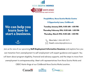 Join us for one of our upcoming Self-Employment Information Sessions and explore how you can transition from unemployment to self-employment with expert guidance and support. You will learn about program eligibility, financial and advisory supports, and the steps to move from unemployment to entrepreneurship. Meet with representatives from Nova Scotia Works and CBDC Hants-Kings at our Coldbrook Nova Scotia Works Location.
