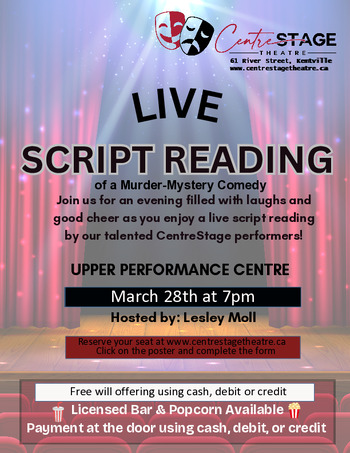 Join us for a riotous staged reading of a Comedy Murder Mystery, where the clues are hilarious and the suspects are utterly inept.