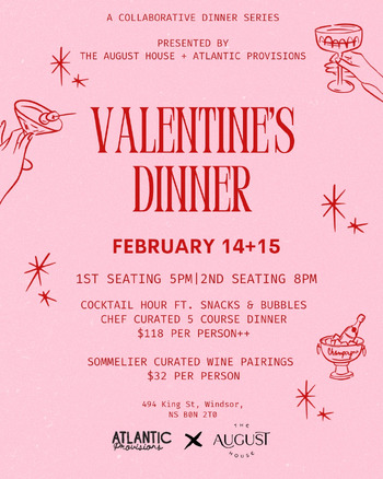 This Valentine's Day, snuggle into the cozy Lillian Hall at The August House and celebrate love with a five-course meal courtesy of the fabulous team from Atlantic Provisions.