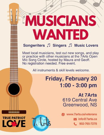 Come to the 7Arts studio to jam with musicians Maura & Geoff. You are welcome to bring an instrument, use one of ours, or just enjoy some live music. All veterans, friends, family, and the public are welcome.