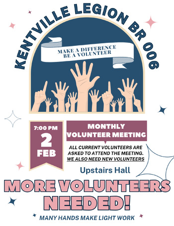 | Mon Feb 23, 7pm Kentville Legion February Volunteer Meeting |