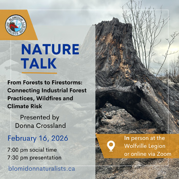 Join the Blomidon Naturalists for our monthly Nature Talk. This month, Donna Crossland explores how current industrial forestry practices, particularly the new high production plantations, destroy ecosystems and fuel wildfires and the climate crisis. She argues that an urgent rethink is needed to prioritize ecological priorities and maintain the forest canopy.