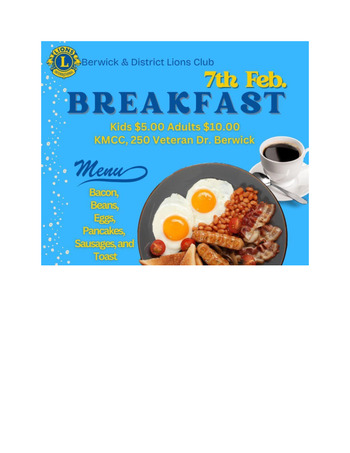 Monthly Community Breakfast, Berwick Lions Club, Appledome, Veterans Drive, Berwick 8-10am