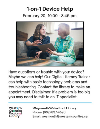 Have questions or trouble with your device? Maybe we can help! Our Digital Literacy Trainer can help with basic technology problems and troubleshooting. Contact the Weymouth library to make an appointment. Disclaimer: If a problem is too big you may need to talk to an IT specialist.