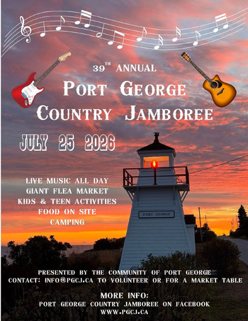 The 38th Port George Country Jamboree is organized by the Port George Regional Recreation Centre and is held rain or shine. This is a welcoming, family-oriented community event that has historically attracted visitors from across Nova Scotia and beyond.