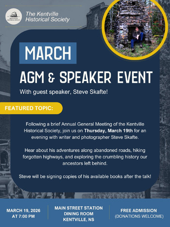 Following Kentville Historical Society's brief Annual General Meeting, Steve Skafte will discuss his adventures along abandoned roads, hiking forgotten highways and exploring the crumbling history that our ancestors left behind. All are welcome!