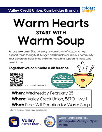 A huge thank you to Callister's Country Kitchen for their kind donation at the Cambridge Branch! Come by, enjoy some warm soup, and help make a difference in our community!