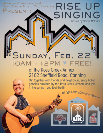 Join us for our second monthly Rise Up Singing, in partnership with the Deep Roots Music Cooperative! This is a chance to get together with family, friends and neighbours, enjoy treats provided by the Ross Creek kitchen, and sing together on a Sunday morning. Sarah McInnis will lead the songs, and you can sing if you want to or just listen and enjoy. We are just happy to bring folks together in this friendly space and start your day off with music and community, since that's what we're all about!