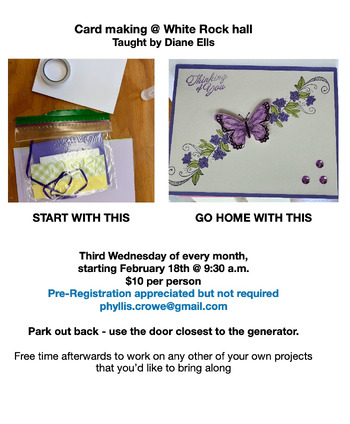 Card Making is part of the White Rock Makers Group, and we make cards on the third Wednesday of each month. Diane Ells teaches, and all materials are supplied. Go home with 4 fabulous cards. Space is limited so pre-registration is appreciated but not required.