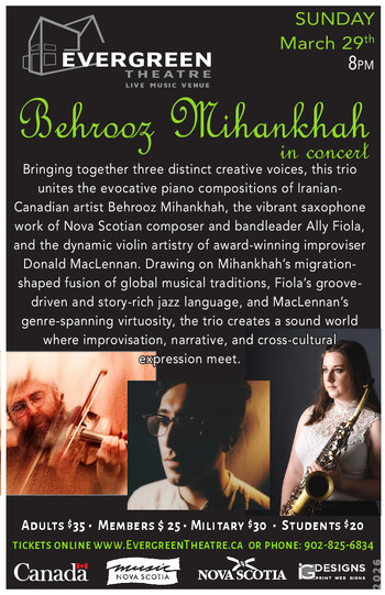 Iranian-Canadian artist Behrooz Mihankhah, the vibrant saxophone work of Nova Scotian composer and bandleader Ally Fiola, and the dynamic violin artistry of award-winning improviser Donald MacLennan. fusion of global musical traditions, Fiola’s groove-driven and story-rich jazz language, and MacLennan’s genre-spanning virtuosity, the trio creates a sound world where improvisation, narrative, and cross-cultural expression meet.
