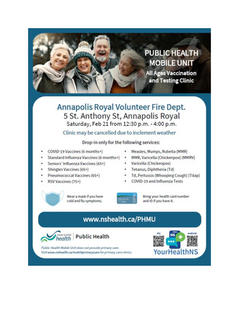 Please visit Public Health Mobile Unit | Nova Scotia Health for a complete list of Immunization clinics.