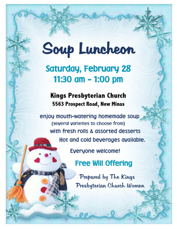 Come enjoy a variety of homemade soups and assorted desserts. Everyone welcome. Free Will Offering.