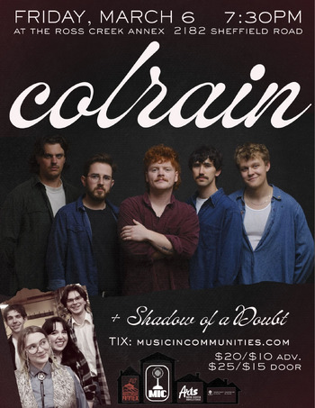 Hailing from Wolfville, Nova Scotia, Colrain is an indie-folk-rock ensemble known for their rich lyrical content, polished instrumentals and strong ties to their local community. Drawing from diverse musical backgrounds, Colrain’s sound transcends conventional genres, making it uniquely their own. Their dynamic set ranges from melancholic ballads, to uplifting rock, reflecting the vulnerability of love and loss, creating a unique atmosphere of energy and connection with the audience.