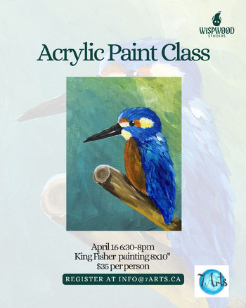 Artist Jenna will guide participants step by step to paint their own kingfisher (bird) using acrylic paints. All participants will go home with a completed 8 x 10" canvas. Register by email.