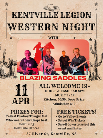 Slap on your chaps, grab your tallest cowboy/cowgirl hat and join us for our Western Night with live music by Blazing Saddles! There'll be prizes for Best Dressed (who wears their chaps best!), Tallest Hat (hats will be permitted to be worn for this special themed dance) and Best Line dancing!!! See you at the corral (aka Kenville Legion).