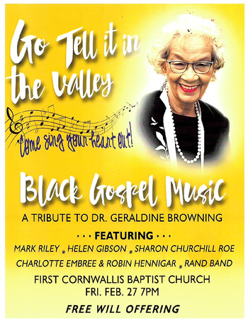 Go Tell it in the Valley! Black Gospel Music featuring Mark Riley, Helen Gibson, Sharon Churchill Roe, Charlotte Embree & Robin Hennigar, Rand Band.