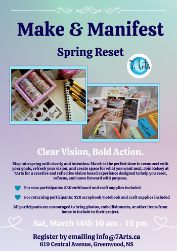 Step into spring with clarity and intention. March is the perfect time to reconnect with your goals, refresh your vision, and create space for what you want next. Join Kelsey at 7Arts for a creative and reflective vision board experience designed to help you reset, refocus, and move forward with purpose.