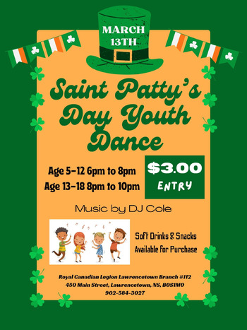 There is a Youth Dance at the Lawrencetown Legion for Saint Patrick's Day on March 13th. Ages 5-12 are from 6pm-8pm. Ages 13-18 are from 8pm-10pm. $3.00 Entry at the door. Snacks and drinks are available for purchase. Music supplied by DJ Cole.