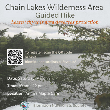 Join BNS Board Member Linda Hutchinson for a hike through part of the proposed protected Chain Lakes Wilderness and discover the fragile beauty and learn what makes this area so unique. This is an out-and-back hike starting from the Anna's Maple Cafe following an ATV trail through the forest. After the hike, there is an opportunity to purchase hot beverages and/or goodies (or maple syrup!) from the cafe. This hike is dog friendly.