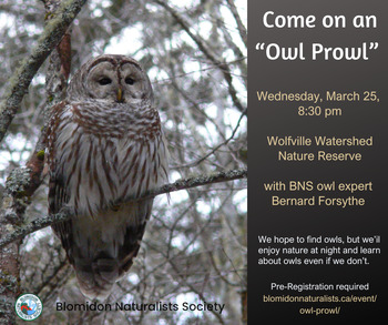 Would you like to learn more about owls and perhaps spot one? Then join the Blomidon Naturalists' Owl Prowl with 'Owl Man' Bernard Forsythe!