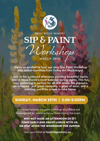 Join us for a relaxed, fun afternoon painting beautiful lupins - one of Nova Scotia's most beloved spring sights. This cozy gathering is all about embracing your creative side, no matter your skill level. There's no pressure and no critiques, just a welcoming space to unwind, sip, socialize and leave with something you're proud of.