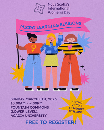 Register for up to five 50-minute learning sessions by women, for women on women's issues. The registration document contains a link to the descriptions of each of the 13 presentations to choose from. All of this is part of the Nova Scotia's International Women's Day weekend of events.
