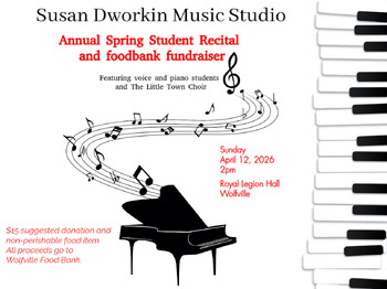 Enjoy an uplifting afternoon of music as Susan Dworkin Music Studio presents voice and piano students alongside The Little Town Choir on Sunday, April 12, 2026 at 2:00 pm at the Royal Canadian Legion Hall, Main Street, Wolfville. This community concert celebrates music-making of all ages while supporting a vital local cause.