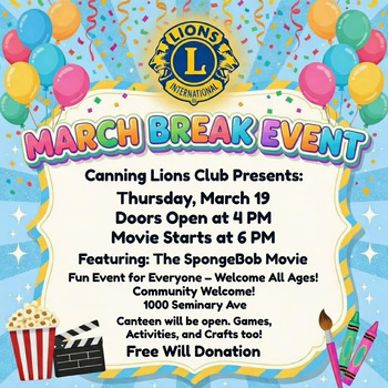 The Canning & District Lions Club is excited to invite students and their families to a March Break Family Movie Night at the Canning Lions Hall (1000 Seminary Ave).